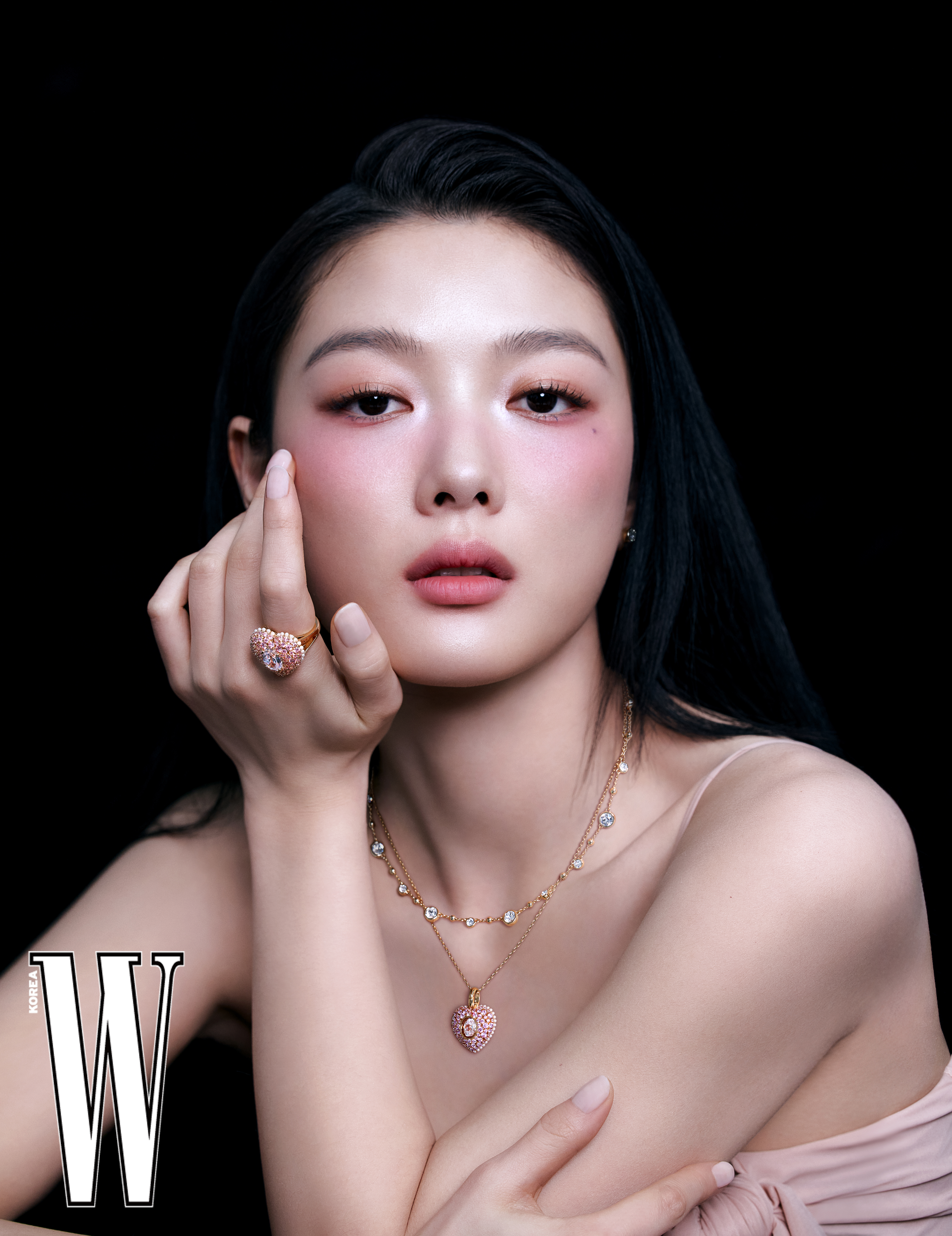또 다른 화보 속 김유정은 누드 톤의 핑크 드레이프 탑에 핑크 컬러 하이퍼볼라 하트 팬던트와