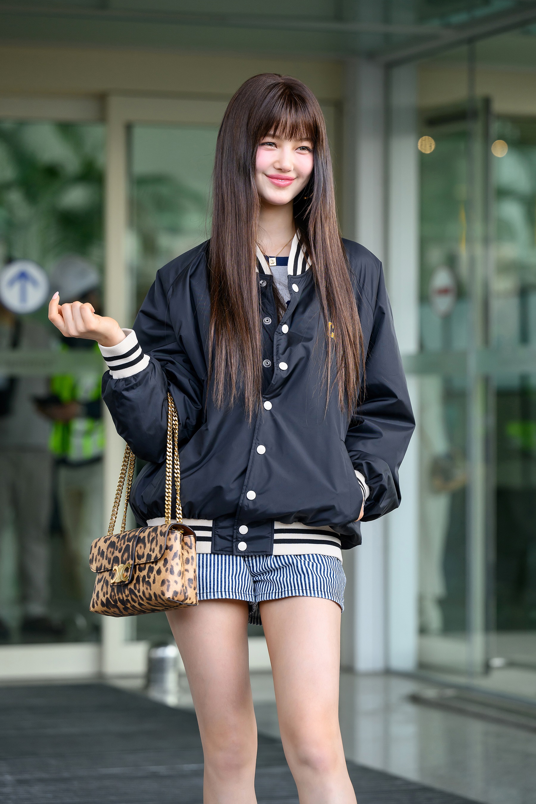 이날 화사한 비주얼에 미소를 띠며 공항에 등장한 다니엘은 캐주얼한 감성의 공항패션을 선보여 눈길을 끌었다. 다니엘은 모던한 느낌의 테디 자켓과 캐주얼한 로고 티셔츠, 스트라이프 쇼츠와 함께 러너 스니커즈를 착용해 편안하면서도 세련된 룩을 선보였고, 여기에 유니크하면서도 고급스러운 레오파드 프린트의 셀린느 틴 빅투아르 백(CELINE TEEN VICTOIRE)로 포인트를 주며 페미닌한 감성을 더했다.
