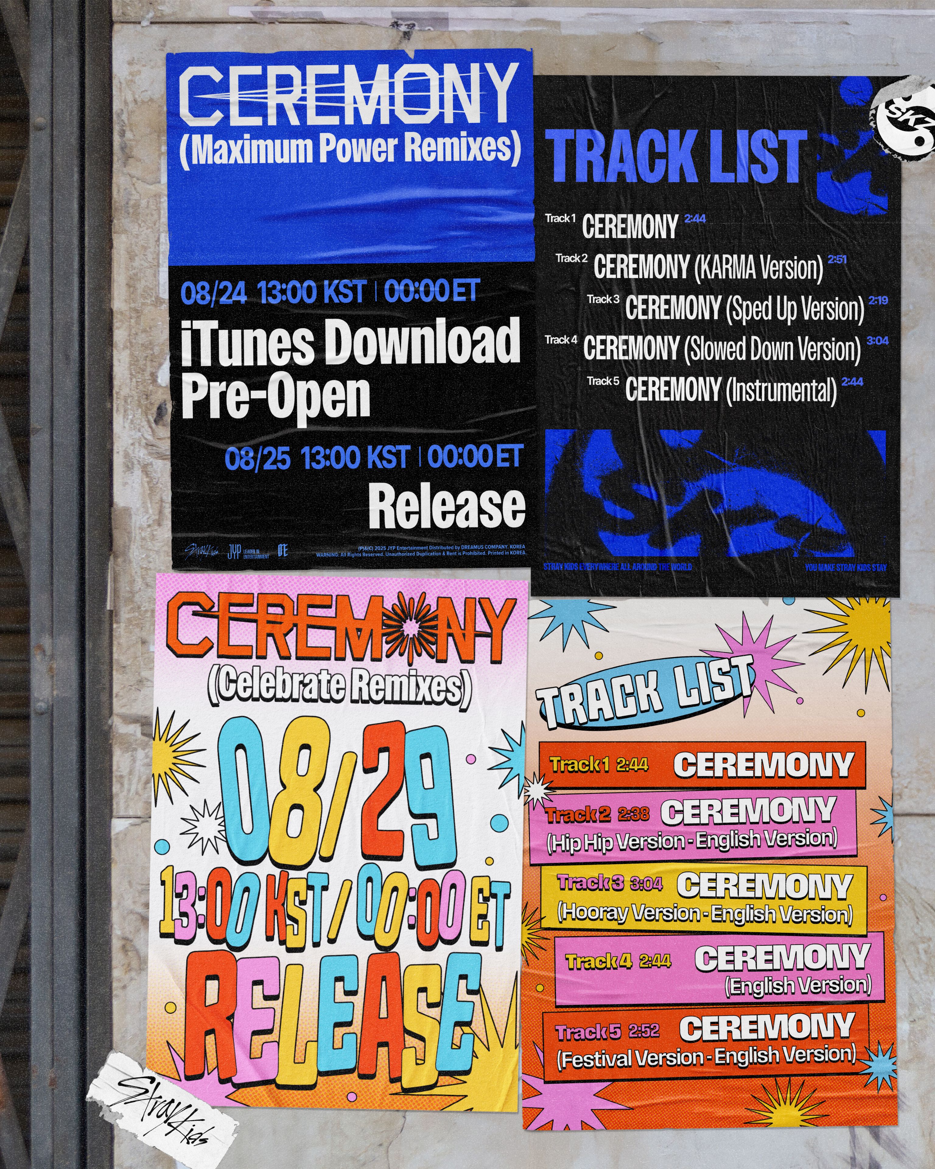 기세를 몰아 이들은 원곡이 가진 매력을 더욱 다채롭게 살린 리믹스 싱글을 선보인다. 24일 0시 그룹 공식 SNS 채널에 게재된 리믹스 디지털 싱글 타임테이블 포스터에 따르면 스트레이 키즈는 25일 오후 1시 'CEREMONY (Maximum Power Remixes)'(맥시멈 파워 리믹시즈), 29일 오후 1시 'CEREMONY (Celebrate Remixes)'(셀레브레이트 리믹시즈)를 발표한다. 러프하고 세련된 푸른빛 디자인, 알록달록한 색감으로 축제 분위기로 연출된 타임테이블 이미지에서부터 각기 다른 음악 컬러와 곡 무드를 예감케 한다.