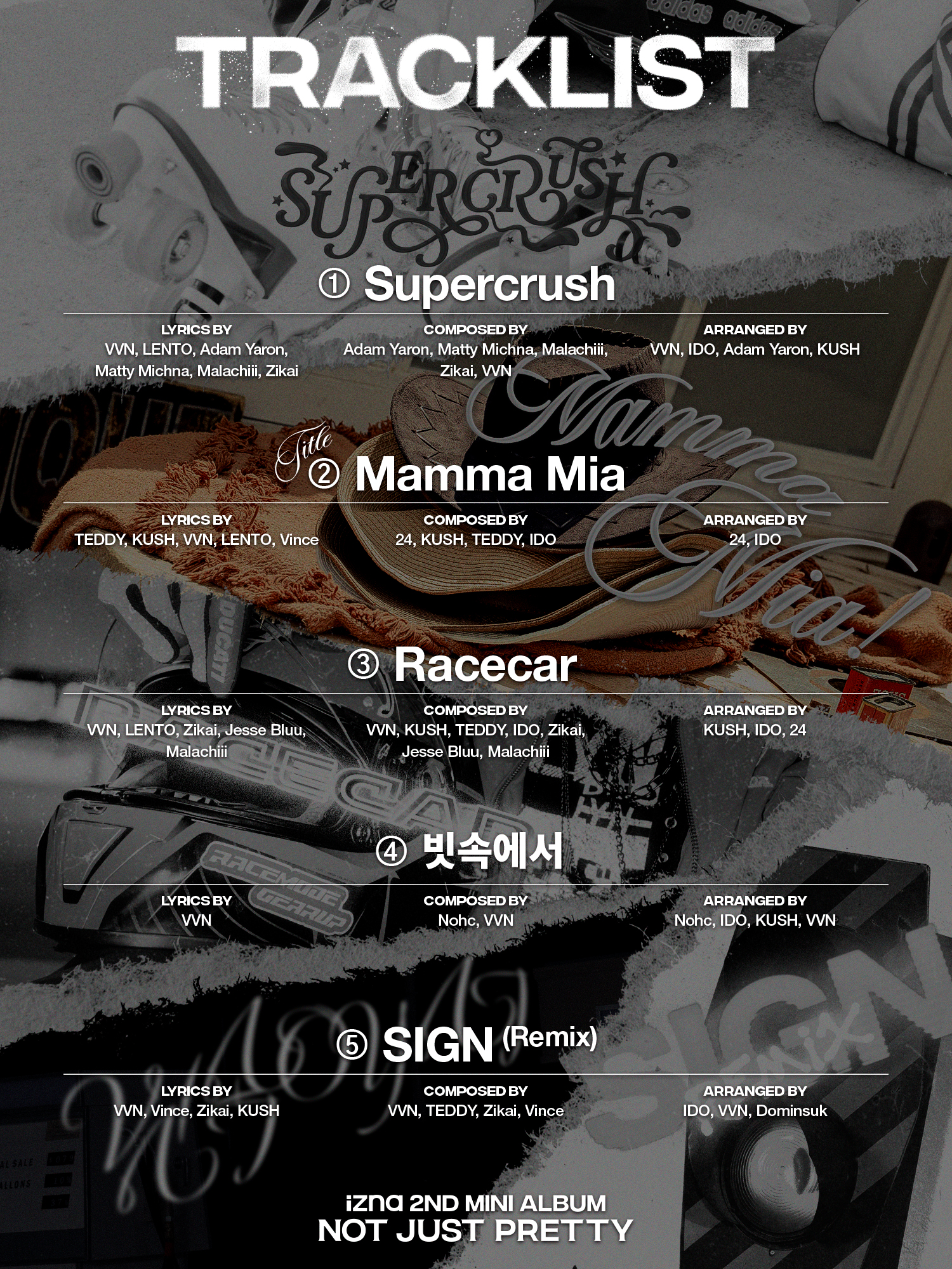 트랙리스트에 따르면 이번 앨범은 타이틀곡 ‘Mamma Mia(맘마미아)’를 비롯해 ‘Supercrush(슈퍼크러시)’, ‘Racecar(레이스카)’, ‘빗속에서’, ‘SIGN(사인) (Remix)’까지 총 5곡이 수록된다.