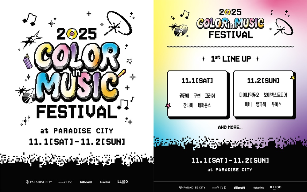 17일 주최사 빌보드코리아는 오는 11월 1일과 2일 인천 파라다이스시티에서 개최되는 '2025 컬러 인 뮤직 페스티벌(2025 Color in Music Festival, 이하 CMF)'의 1차 라인업을 공개했다.