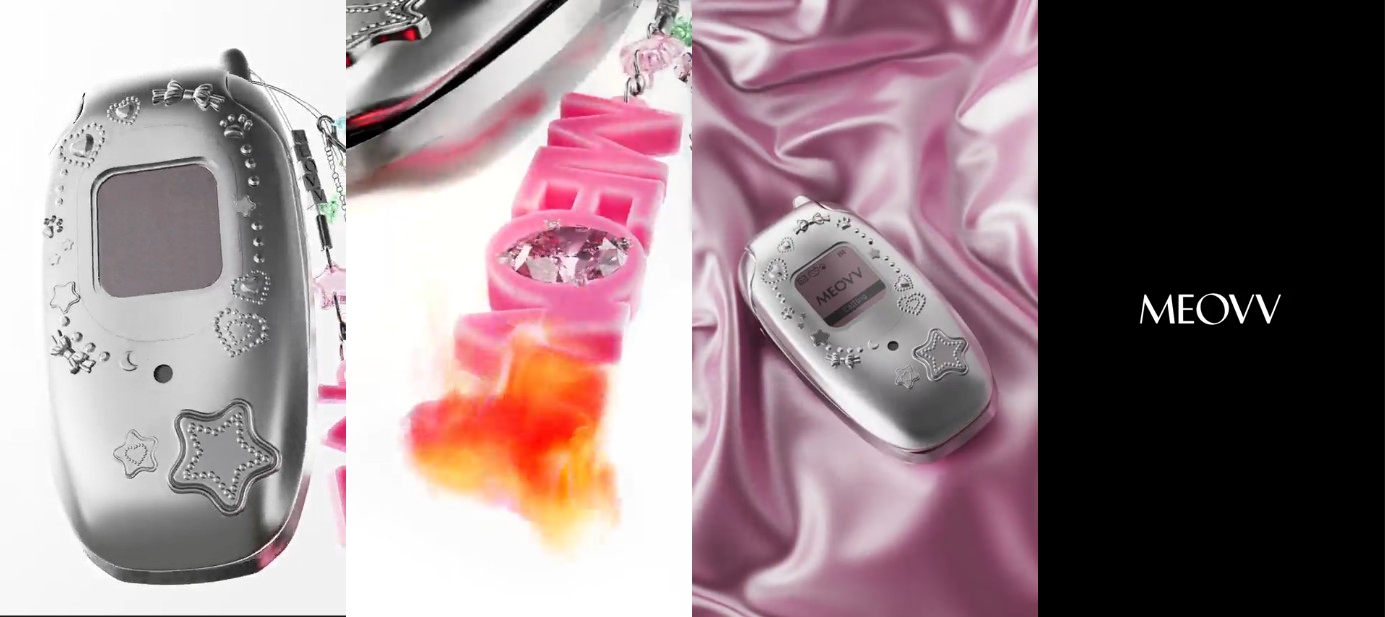 공개된 영상에는 2000년대 초반을 대표하는 통신 수단인 폴더형 피처폰의 모습이 담겨 있어 눈길을 끈다. 이내 피처폰에 달려 있는 'MEOVV' 레터링 액세서리가 불붙으며 타올라 무엇을 상징하는지 궁금증을 자극한다.
