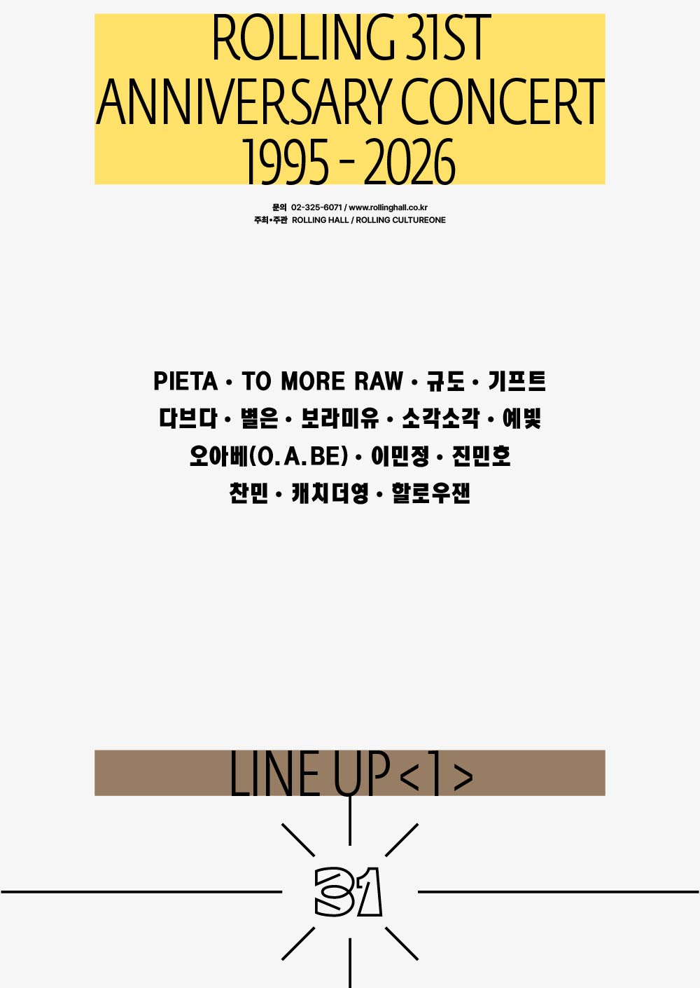 이번에 공개되는 1차라인업에는 청량한 음색으로 사랑받는 보라미유, 섬세한 감성과 따뜻한 음색을 지닌 싱어송라이터 예빛, 작사·작곡·가창력의 균형으로 깊은 울림을 전하는 진민호, 규도, 기프트, 별은, 소각소각, 오아베, 이민정, 찬민, 캐치더영, 투모로우, 피에타, 할로우잰×다브다까지 총 15팀이 합류해 31주년 프로젝트의 서막을 알린다.