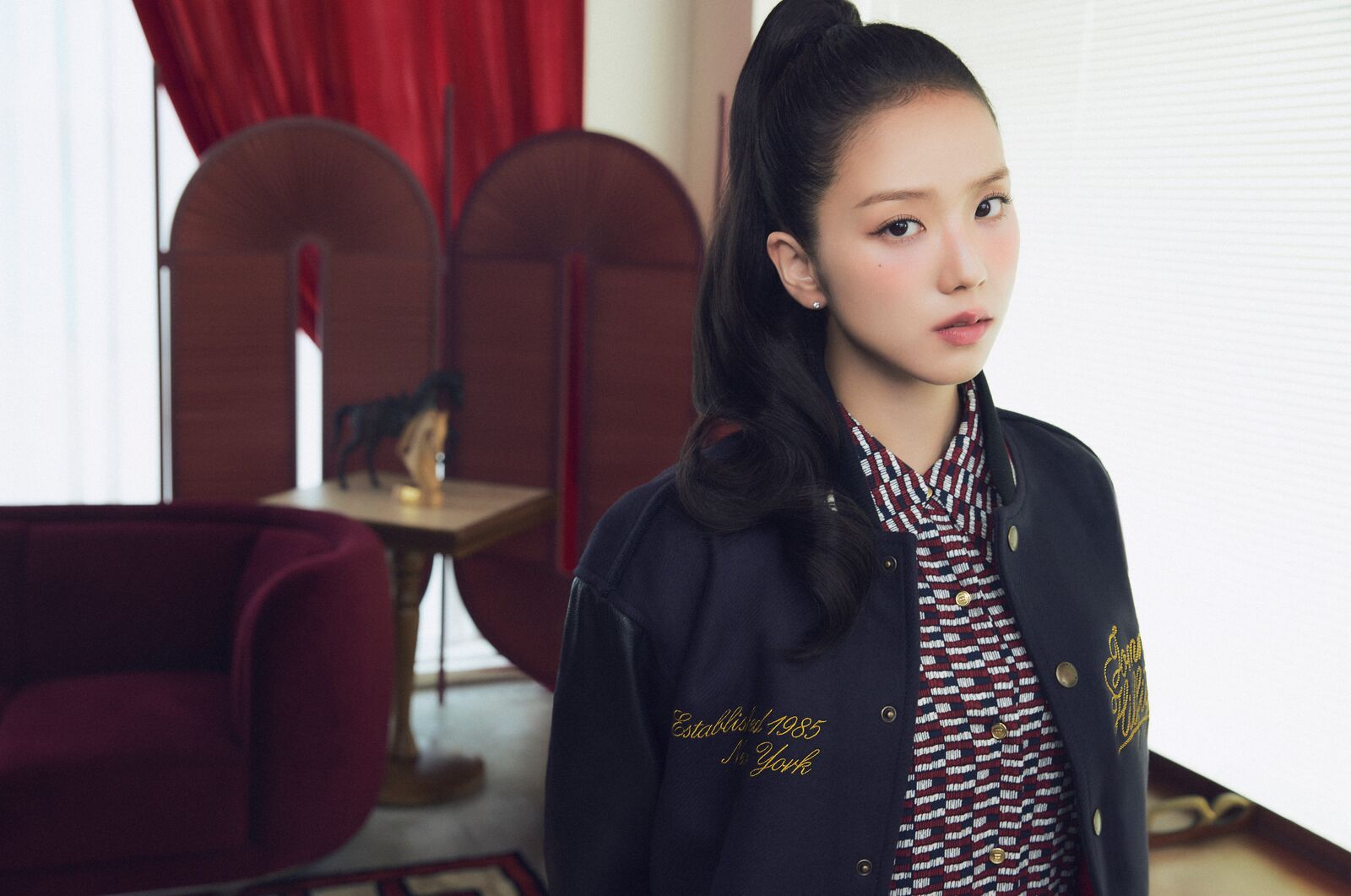 공개된 화보에서 지수는 울 혼방 소재의 레더 바시티 재킷을 패턴 원피스와 매치해 클래식한 프레피 스타일에 러블리한 위트를 더했다.