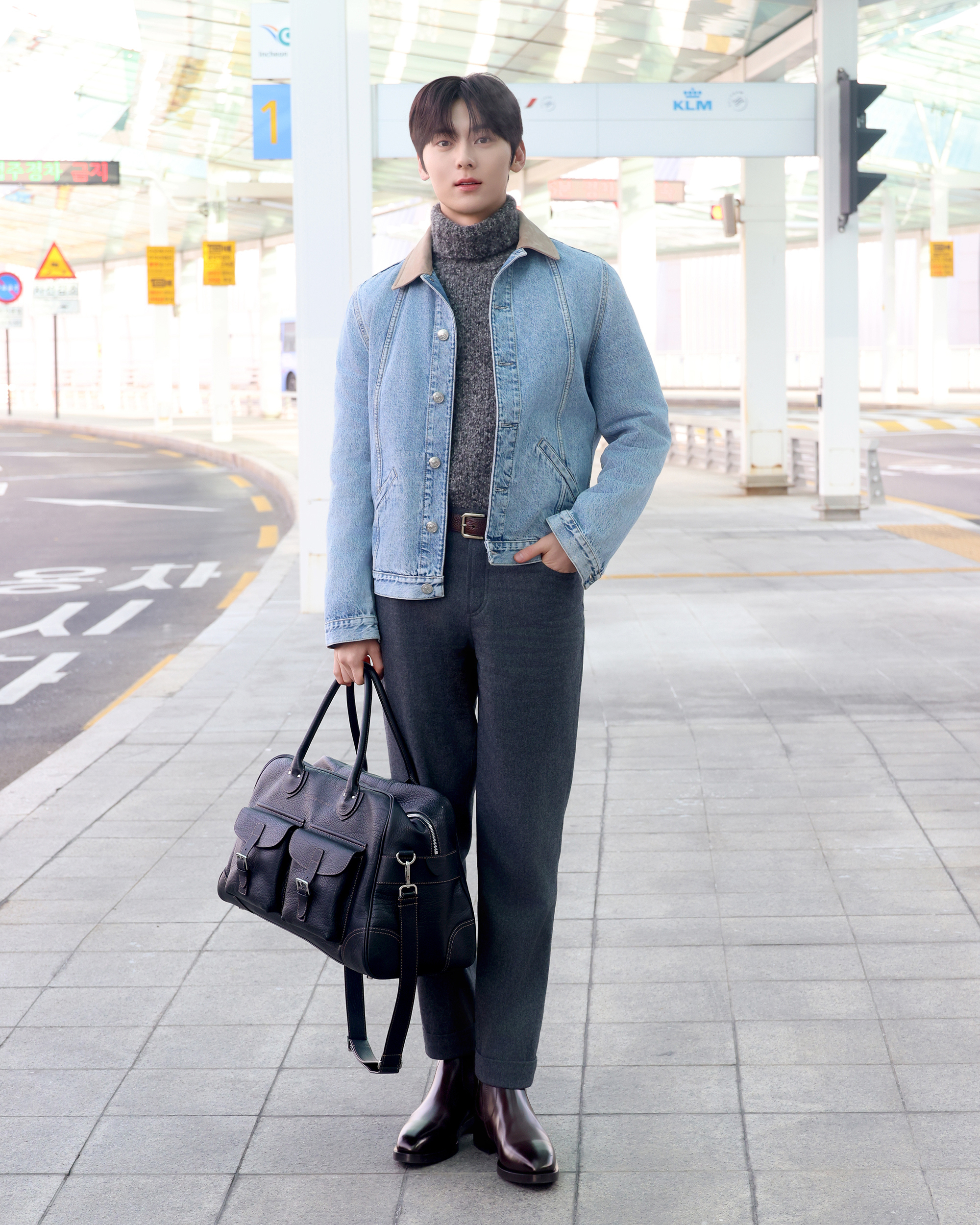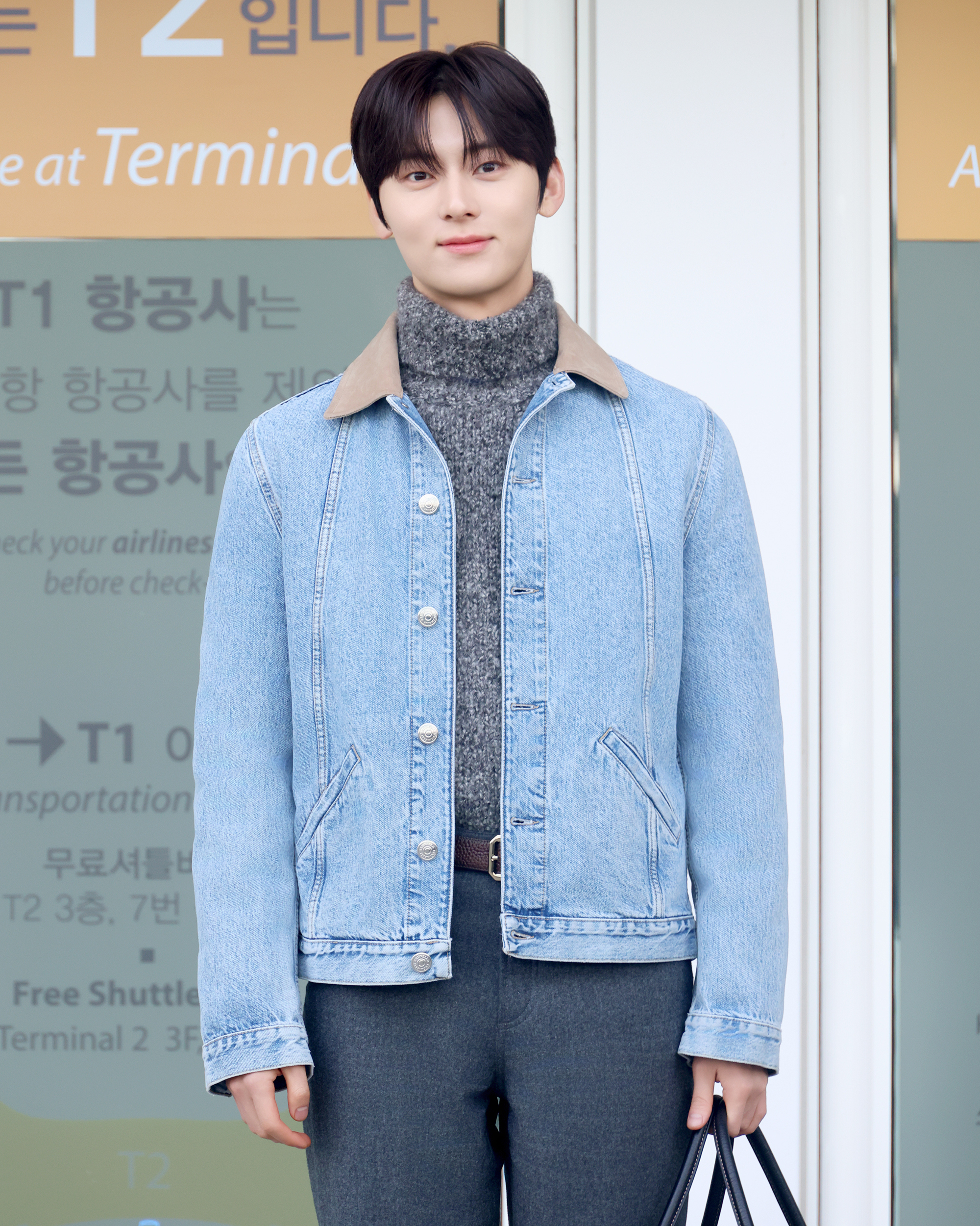 이날 훈훈함 가득한 비주얼로 공항에 등장한 황민현은 세련된 캐주얼 무드의 공항패션을 선보였다. 그는 스웨이드 카라가 포인트인 연청 데님 재킷에 그레이 컬러의 알파카 울 터틀넥 스웨터를 착용해 부드러운 분위기를 더했으며, 릴랙스드 핏의 울 팬츠로 트렌디하면서도 자연스러운 실루엣을 완성했다. 여기에 블랙 카프스킨 레더 벨트와 은은한 광택감의 지퍼 부츠, 전면 포켓 디테일이 돋보이는 블랙 위켄더 백을 매치해 캐주얼 룩에 고급스러운 포인트를 더하며 감각적인 ‘꾸안꾸’ 스타일을 완성했다.