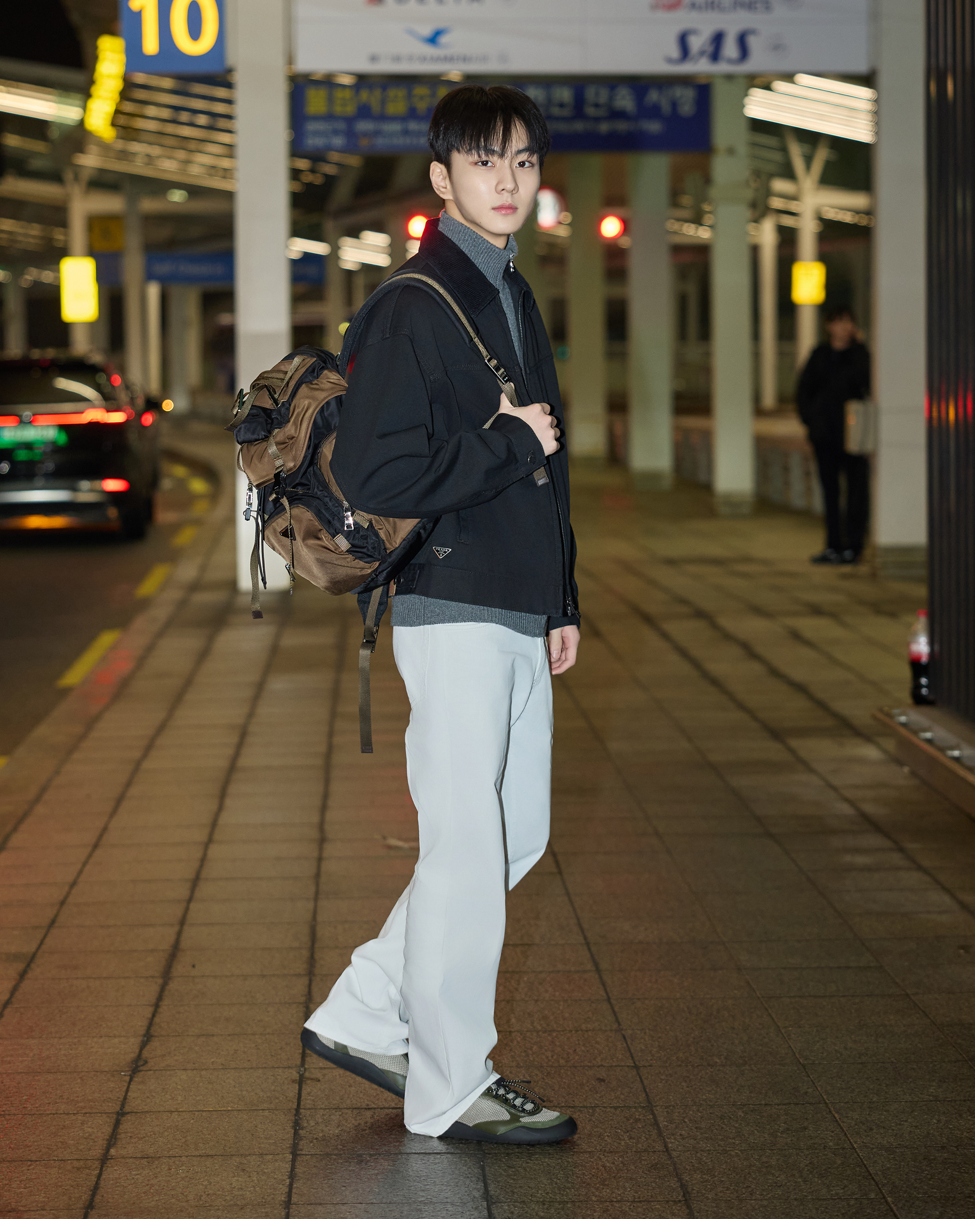 희승은 블랙 가죽 재킷에 카키 니트와 네이비 팬츠를 매치하고, 네이비 스피드록 메쉬 스니커즈와 버클 백으로 세련된 공항룩을 연출했다.
