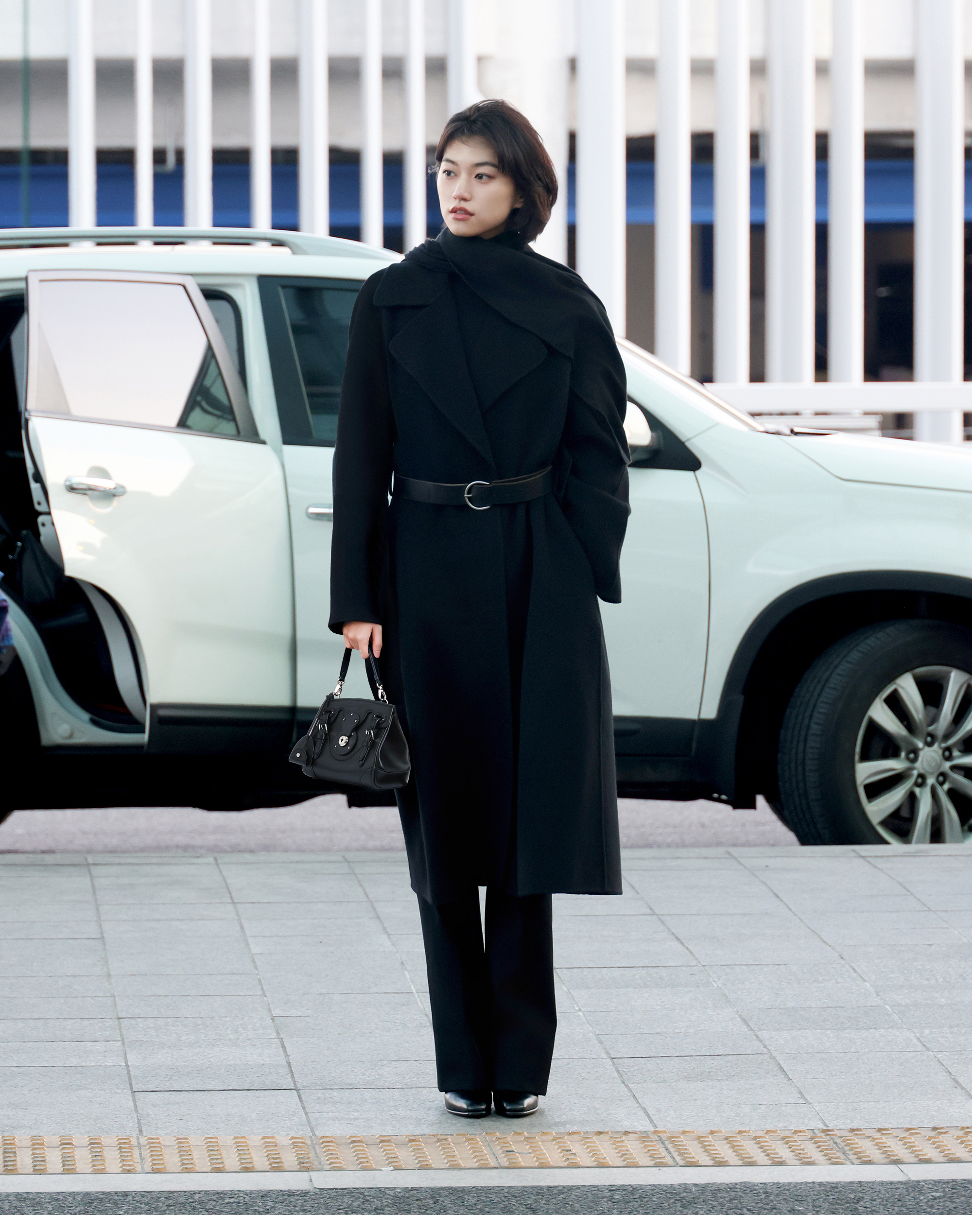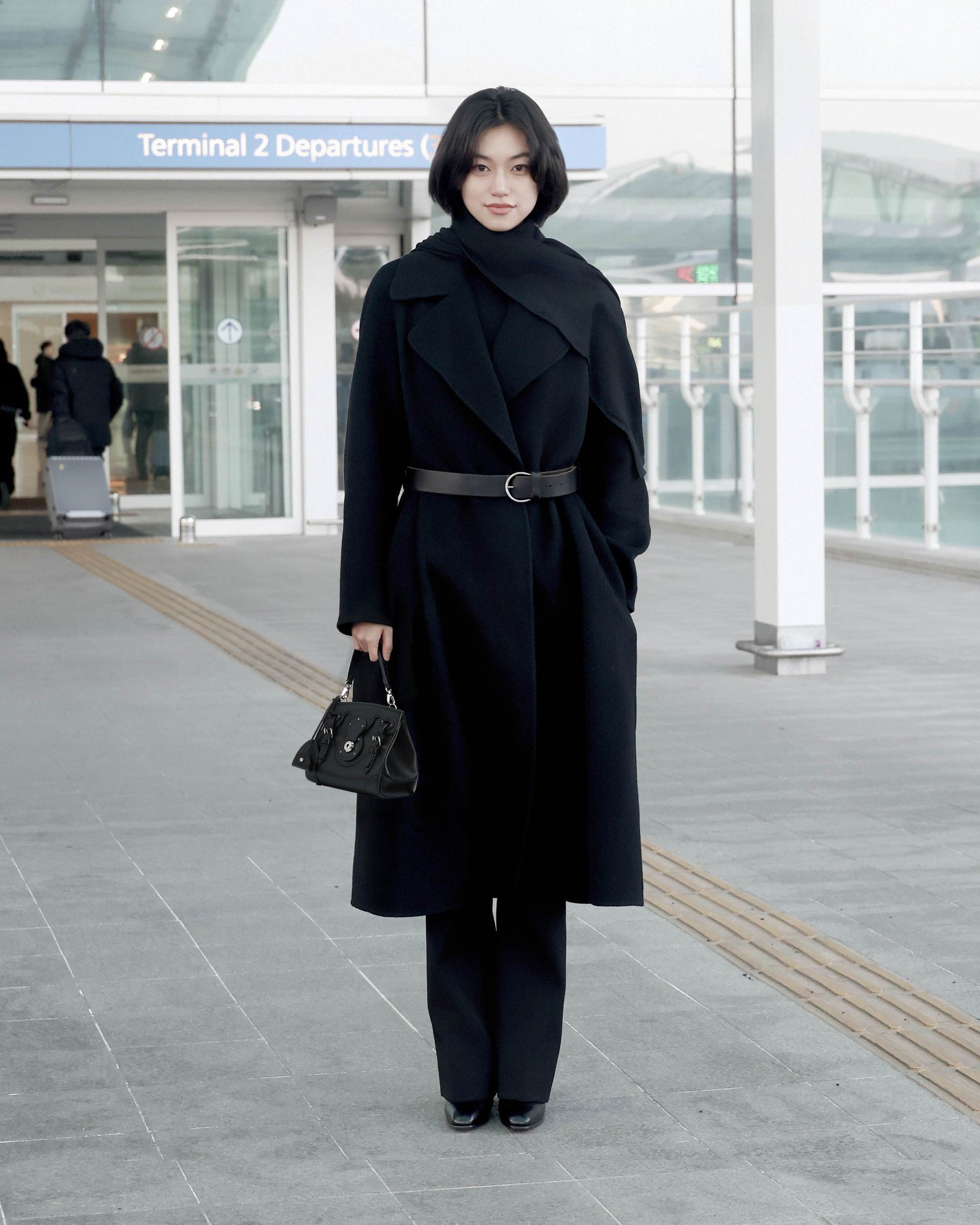 여기에 미니멀한 디자인의 블랙 컬러 백을 매치해 과하지 않으면서도 균형 잡힌 공항패션을 완성했다.