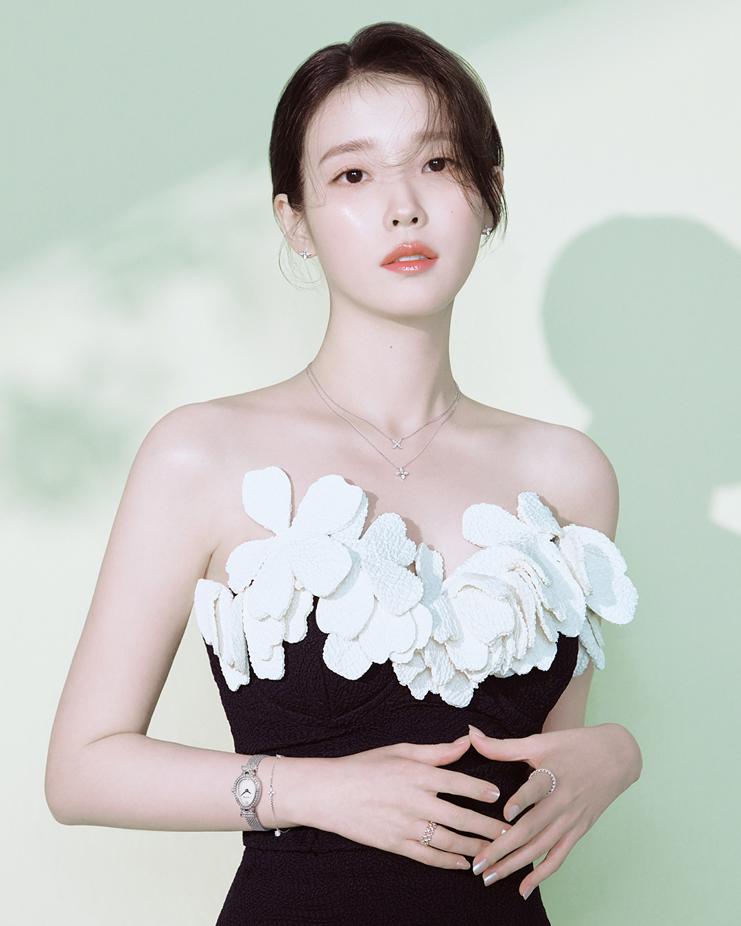 또 다른 컷 속 아이유는 화려한 블랙 튜브톱 드레스에 입체적인 ‘브리즈(BREEZE)’ 실버 주얼리를 매치해 모던한 비주얼을 강조했다. 페어 컷 스톤이 포인트로 더해져 꽃잎의 움직임을 퓨어하게 표현한 ‘브리즈(BREEZE)’ 주얼리와 54개의 스톤 세팅이 인상적인 ‘티아라(TIARA)’ 메탈 시계를 함께 착용하여 화사한 포인트를 더했다.