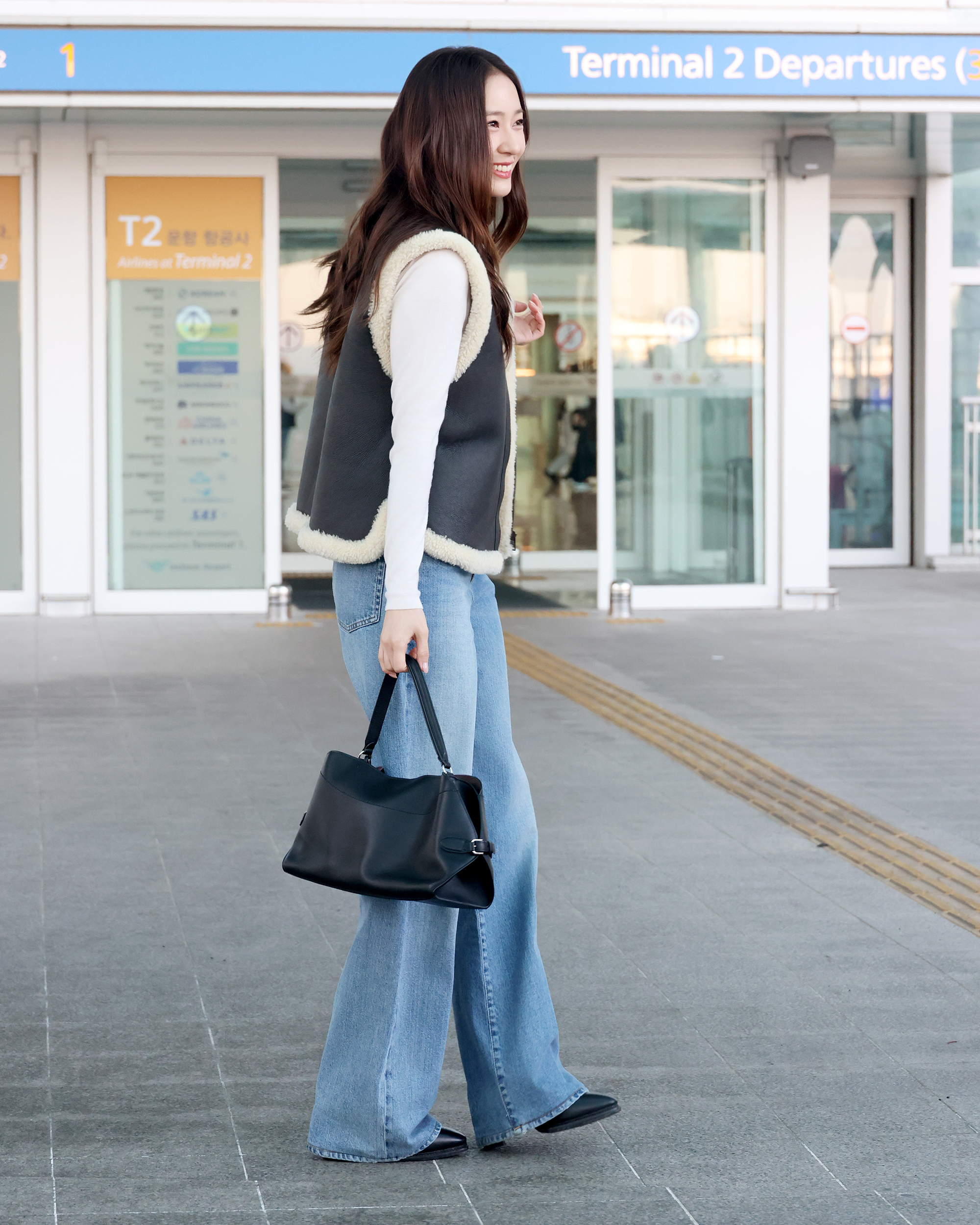 미드 라이즈의 릴렉스 와이드 레그 실루엣의 데님팬츠를 착용해 깔끔한 스타일을 완벽 소화했다. 여기에 유니크한 쉐입이 돋보이는 숄더백을 들어주며 럭셔리한 공항패션의 정석을 선보였다.