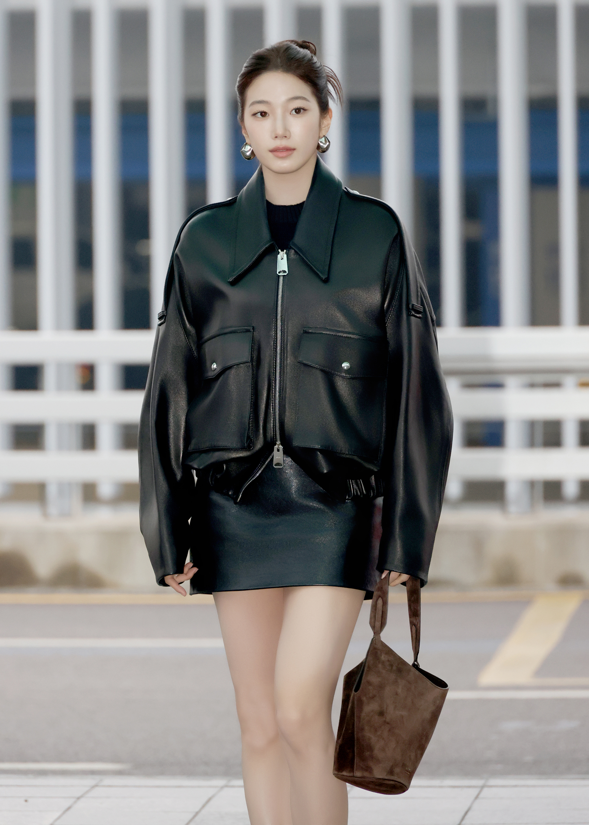 이날, 카즈하는 아메리칸 럭셔리 디자이너 브랜드 케이트(Khaite)의 캐시미어 소재 풀오버와 이탈리아산 글로시 램스킨으로 제작한 미니멀한 미니스커트에 플롱제 가죽(plongé leather) 소재의 구조적인 보머 재킷을 아우터로 착용해 시크한 블랙 가죽 스타일링을 선보였다.