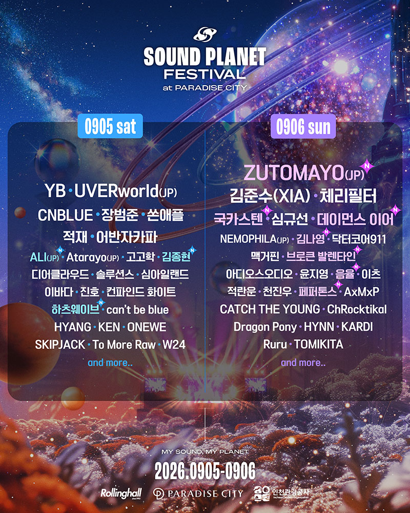 롤링홀이 주최하는 ‘사운드플래닛페스티벌 2026’이 28일 정오에 공식 SNS계정을 통해 즛토마요, 페퍼톤스, 데이먼스 이어 등이 포함된 화려한 2차 라인업을 공개해 화제가 되고 있다. 지난 3월 공개됐던 1차 라인업에는 일본을 대표하는 록밴드 UVERworld, 폭발적인 가창력과 퍼포먼스를 겸비한 김준수(XIA), 대한민국 록씬을 이끌어온 국민 밴드 YB, 경쾌한 에너지의 체리필터, 아시아 전역에서 사랑받는 밴드 CNBLUE, 감성적인 싱어송라이터 적재, 국보급 명품보컬 그룹 어반자카파 등이 포함돼 장르와 세대를 아우르는 명단을 공개하며 화제를 모았고 또 깜짝 공개된 추가 라인업에는 국카스텐, ALI(JP), 브로큰 발렌타인, hrtz.wav(하츠웨이브)까지 더해지며 한층 밀도 높은 라인업을 완성했다...