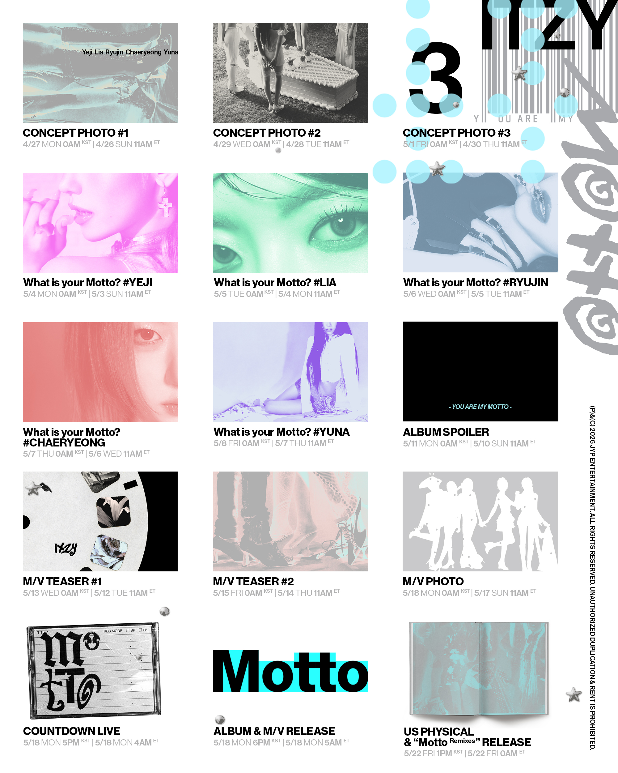 ITZY(있지)가 특별한 미감을 살린 새 앨범 'Motto'(모토) 콘텐츠로 컴백 기대감을 높이고 있다.JYP엔터테인먼트는 27일 0시 ITZY 공식 SNS 채널에 'Motto' 콘셉트 이미지를 최초 공개했다. 멤버들은 공중에 떠있거나 원형 구, 후프에 기대앉아 아슬아슬하고 강렬한 모멘트를 보여줬다. 특히 아무렇지 않은 듯 여유 넘치는 표정과 애티튜드로 시각적 만족을 더했다.앞서 22일에 선보인 트레일러 영상에서도 균형을 유지하며 주저 없이 나아가는 다섯 멤버의 모습이 그려져 몰입감을 선사했다. 기울어진 리무진처럼 삐뚤어진 시선에도 여유만만하고, 흔들리는 순간 속 스스로를 믿으며 밸런스를 지키는 단단함을 아티스틱하게 표현한 개별 신이 이목을 끌었다. 이는 ITZY와의 사전 인터뷰를 통해 구성된 신으로써 ..